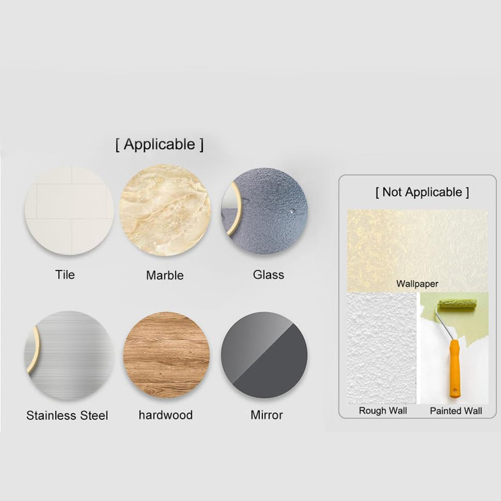 No-Drill Installation: High-strength self-adhesive backplates provide firm, wobble-free mounting on clean, smooth surfaces (tile, glass, metal, sealed wood, acrylic).